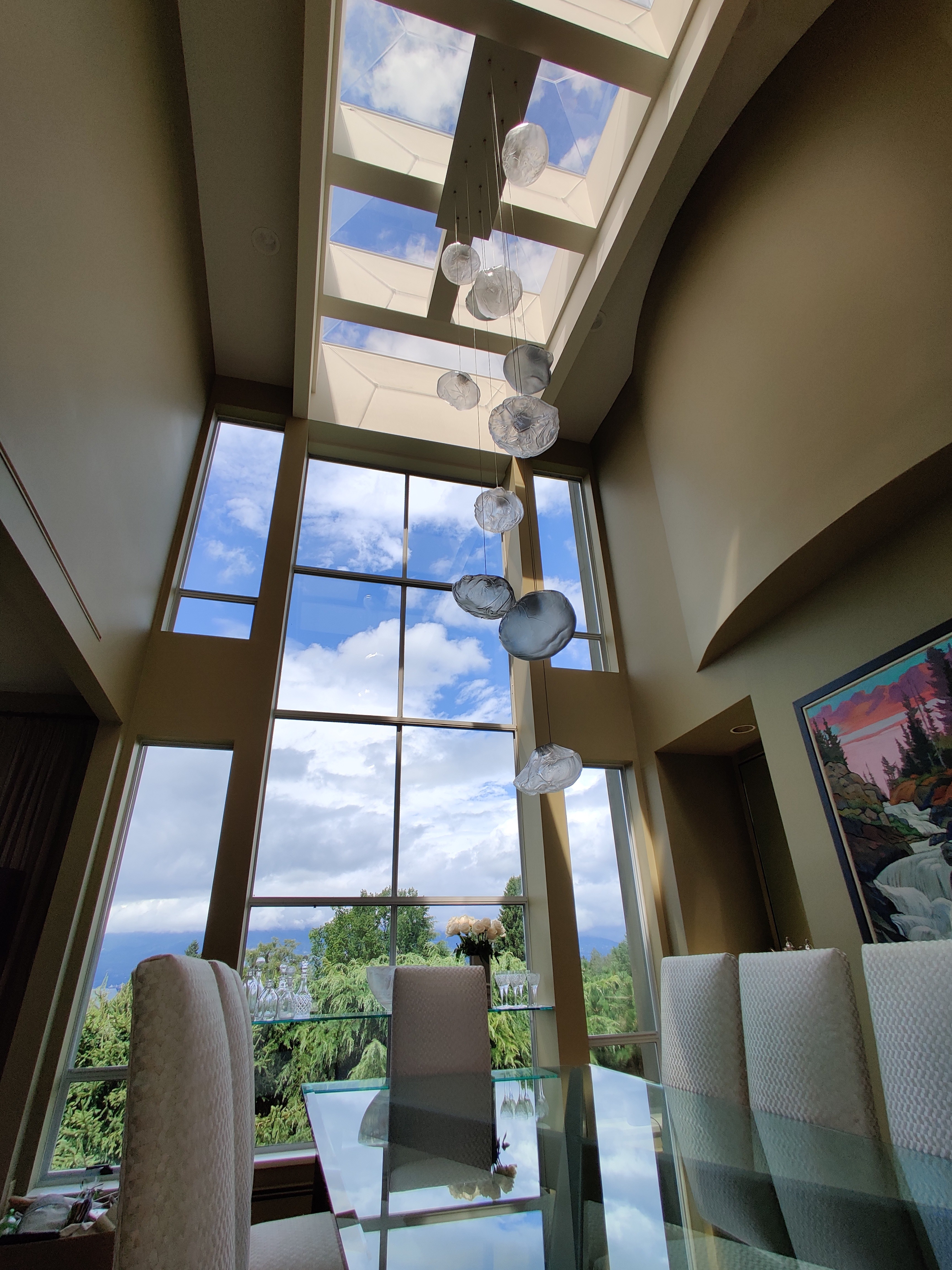 Our team brought this towering dining room light fixture to life. The installation features a custom bocci chandelier, suspended from the double-height ceiling.